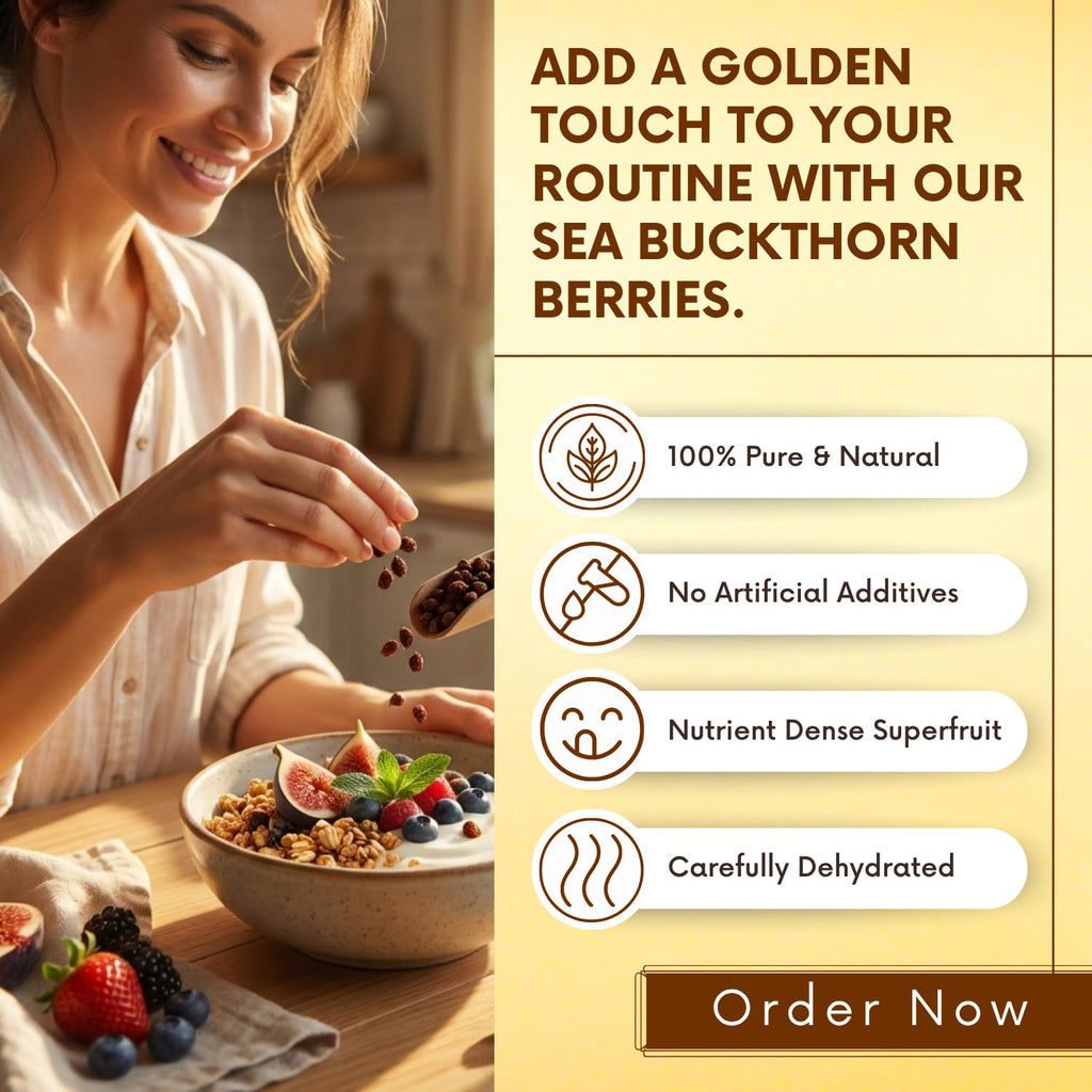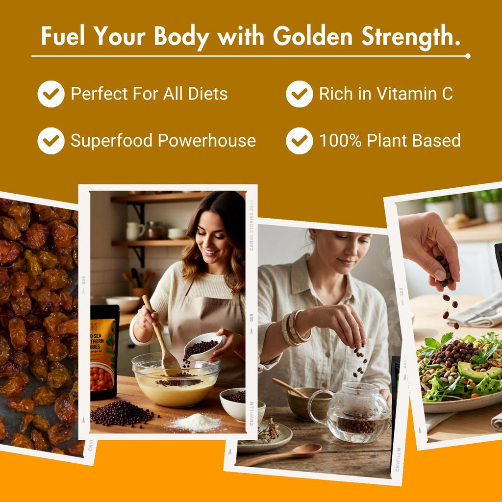 Experience the power of nature with ourย Himalayan Sea Buckthorn Berries (100g), carefully sourced from the pristine Himalayan region. These nutrient-dense berries are naturally sun-dried to preserve their rich profile ofย Omega 3, 6, 7 & 9 fatty acids, along with high levels ofย Vitamin C & E. Known as a natural superfood, Sea Buckthorn helps boost immunity, improve digestion, and support overall wellness.