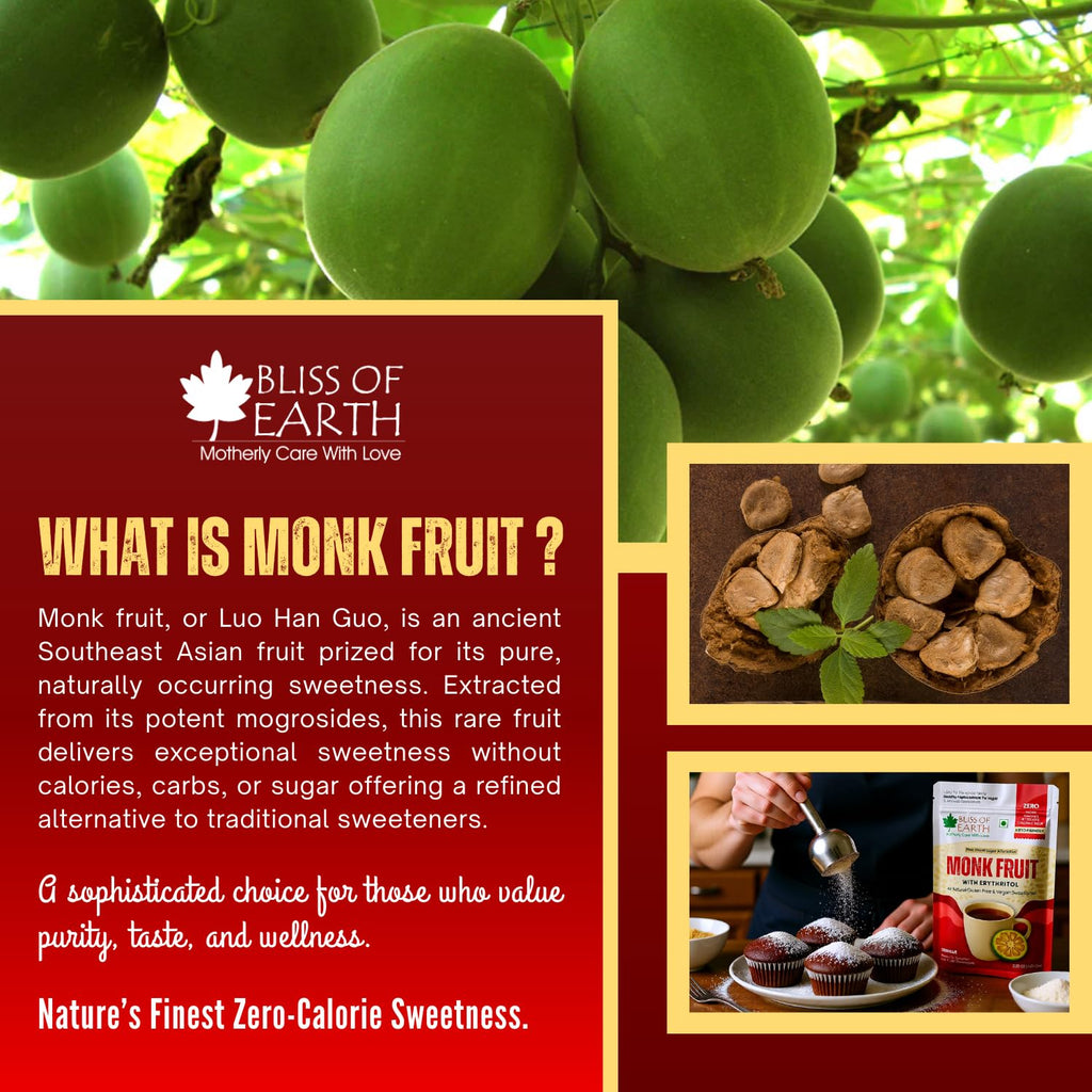 Sugar-Free Sweetness Redefined Experience guilt-free indulgence with Bliss of Earthโs monk fruit and erythritol blend! This natural monk fruit sweetener provides the perfect solution for those seeking to cut sugar without sacrificing flavor. With zero calories and a zero glycemic index, itโs ideal for diabetics and health-conscious individuals alike. Naturally Delicious and Versatile Elevate your culinary creations with this versatile monk fruit sweetener that works seamlessly in baking, cooking, or simply sweetening beverages. Its clean taste and no aftertaste make it the perfect choice for any recipe. Make the smart switch today and enjoy the benefits of a healthier lifestyle!