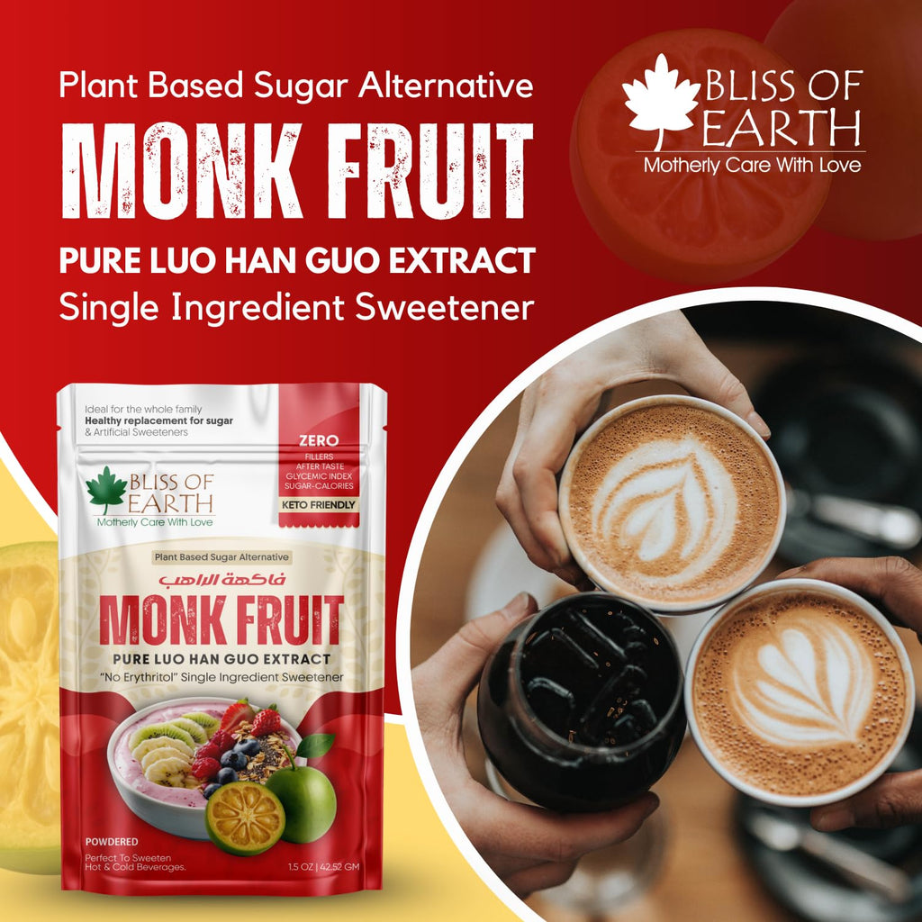 Bliss of Earth Pure Monk Fruit Extract Powder Without Erythritol, Zero Calorie Natural Sugar Free Sweetener, Keto & Diabetic Friendly, Healthy Sugar Substitute for Tea, Coffee, Baking & Cooking, 42.52gm, 850 Servings